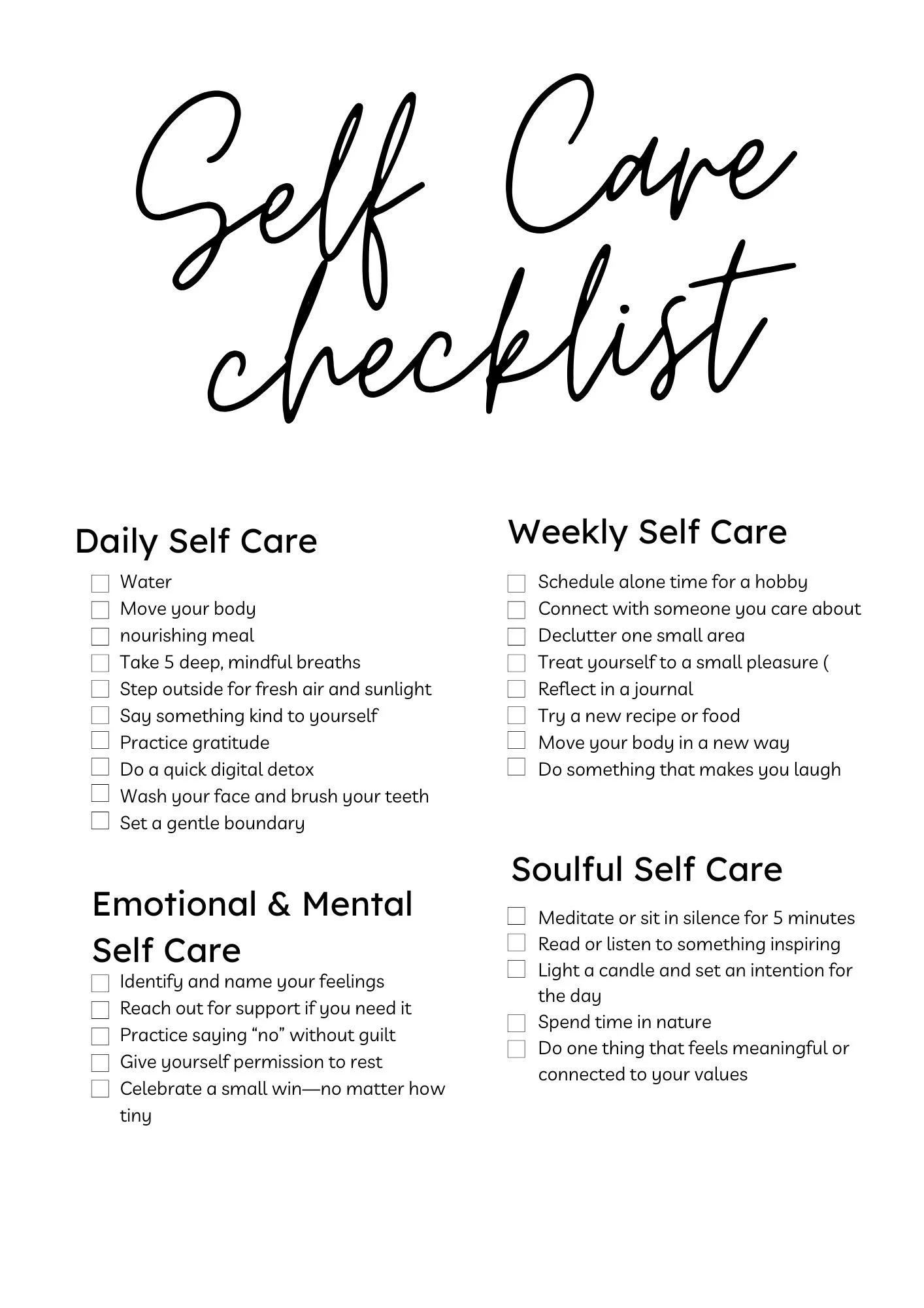 Start by checking off just 3–5 things each day. Self care isn’t about perfection—it’s about progress.